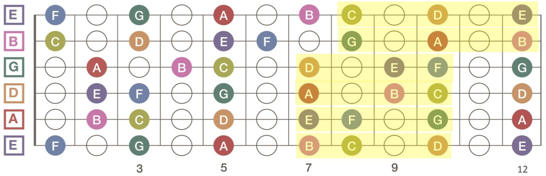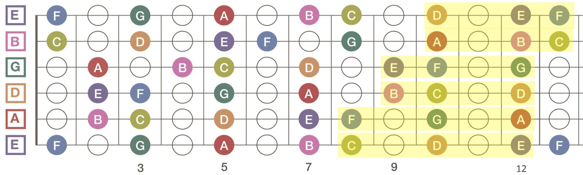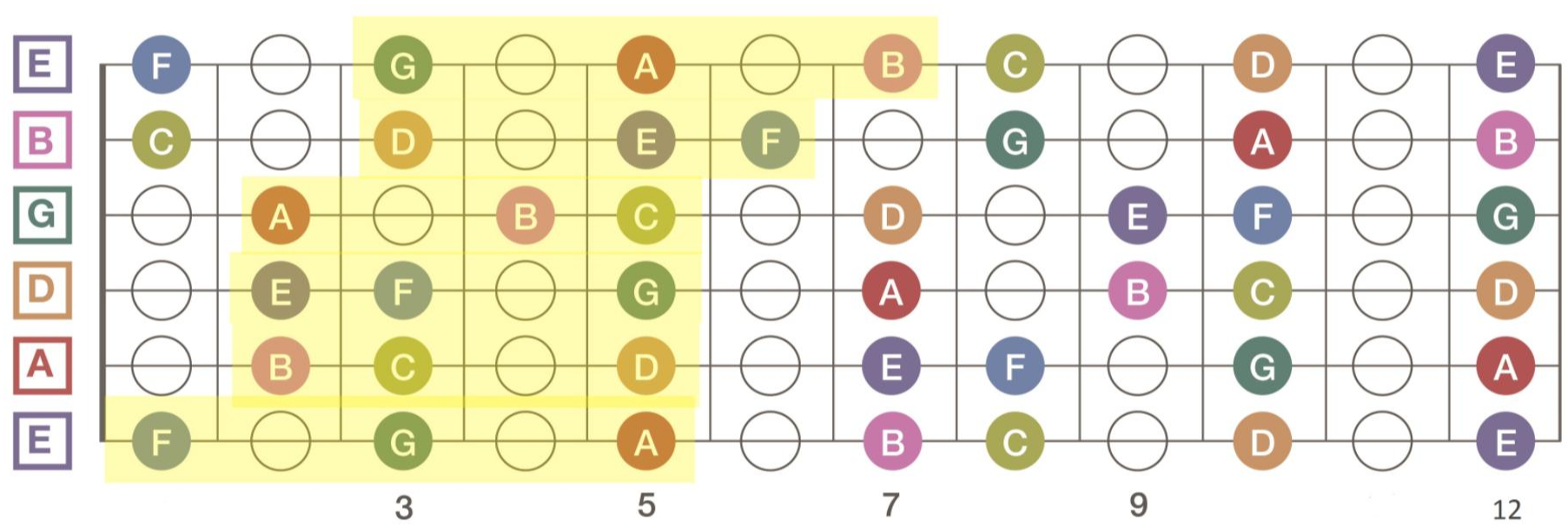CAGED가 패턴을 외우는 방법론이라면 이 3NPS는 패턴을 외우기 보다는 원리를 파악하면 된다. 외우지 않아도 시작음의 계이름을 알면 어떤 종류의 음계든 직관적으로 탈 수 있는 것이 장점이다.